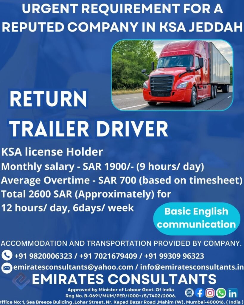 Saudi Arabia jobs | Trailer Driver NaukriVidesh August 25, 2025 Driver, Gulf, Saudi Arabia 0 Comments Saudi Arabia jobs | Trailer Driver Share this post Facebook LinkedIn Pinterest DriverJobsSaudi ArabiaTrailer Post navigation Previous PostUAE |Technical Jobs | MI EnterprisesNext PostQatar | Electrical Technician Leave a Comment Cancel reply Your Name Your Email Save my name, email, and website in this browser for the next time I comment. Your Comment Recent News Articles Fresh job related news content posted each day. August 25, 2025 Burger Maker 0 Comments Saudi Arabia Jobs | Burger Maker Saudi Arabia Jobs | Burger Maker | Fast Food Chef | American Cuisine Read More August 25, 2025 Electrician 0 Comments Qatar | Electrical Technician Qatar | Electrical Technician Read More August 18, 2025 Technical 0 Comments UAE |Technical Jobs | MI Enterprises Read More